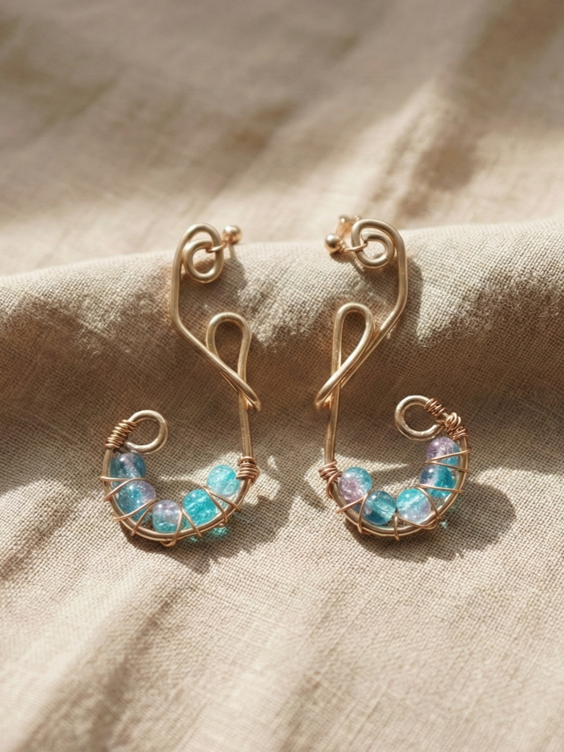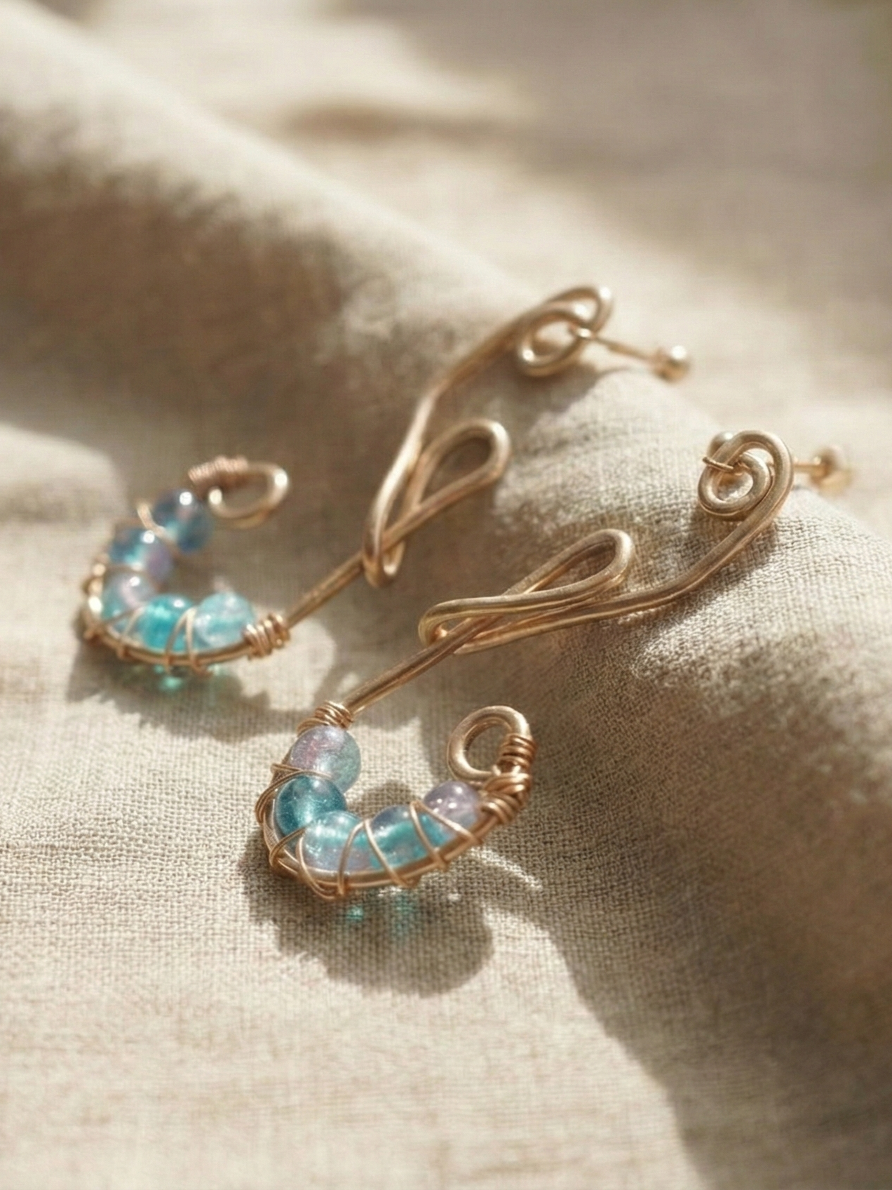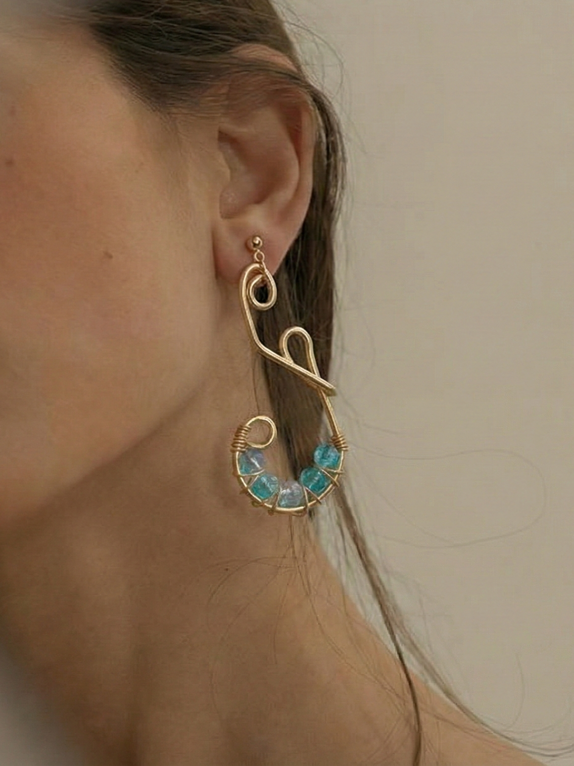 These fishing hook earrings are handcrafted from gold-coloured wire, shaped and wrapped by hand into an open, flowing form. The lower section is detailed with small glass beads in soft blue tones, adding subtle colour and texture to the design.