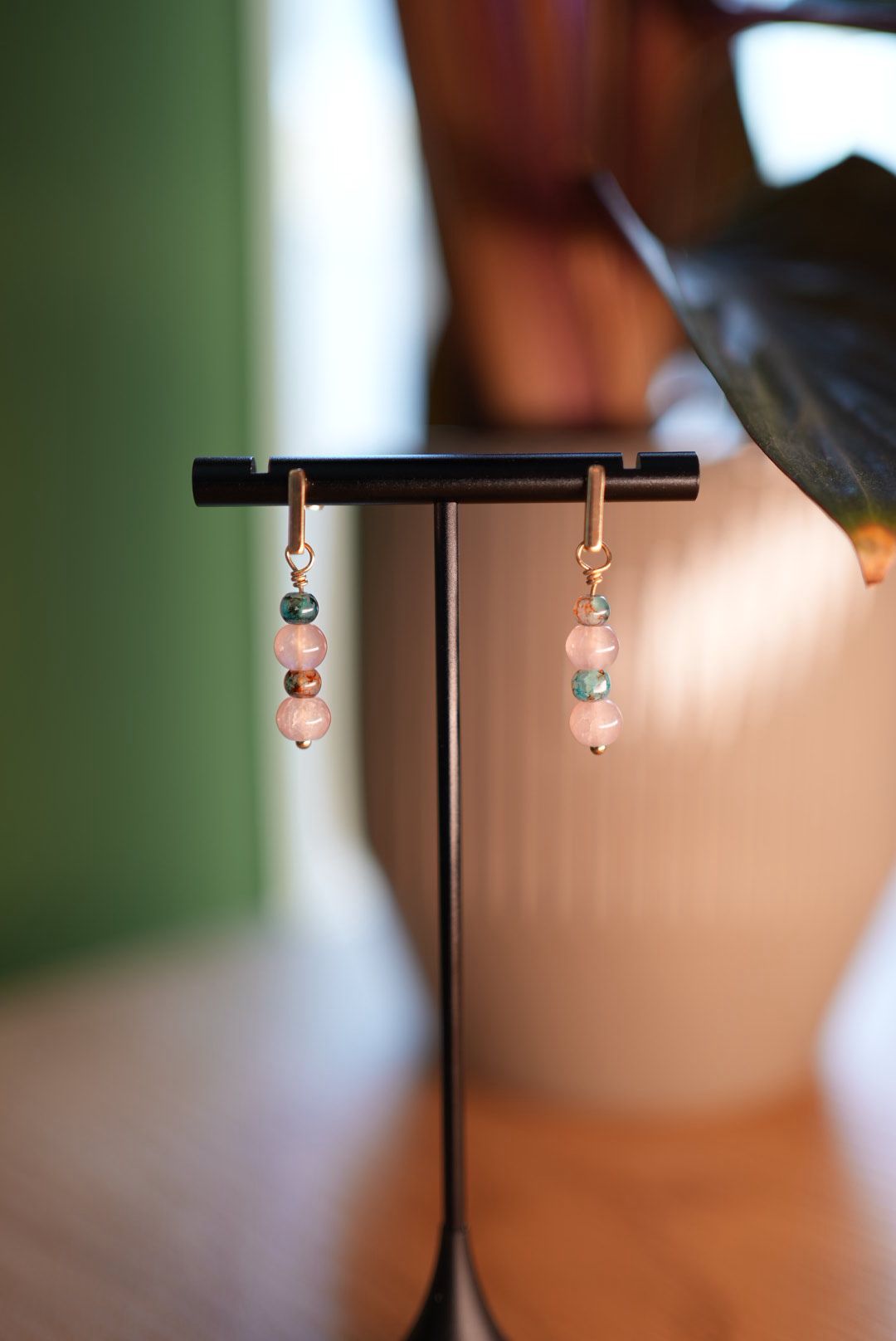 These earrings are handmade using carefully selected beads in soft rose tones, combined with subtle green-blue accents for contrast. The design is simple and balanced, allowing the colours and materials to stand out without feeling heavy.