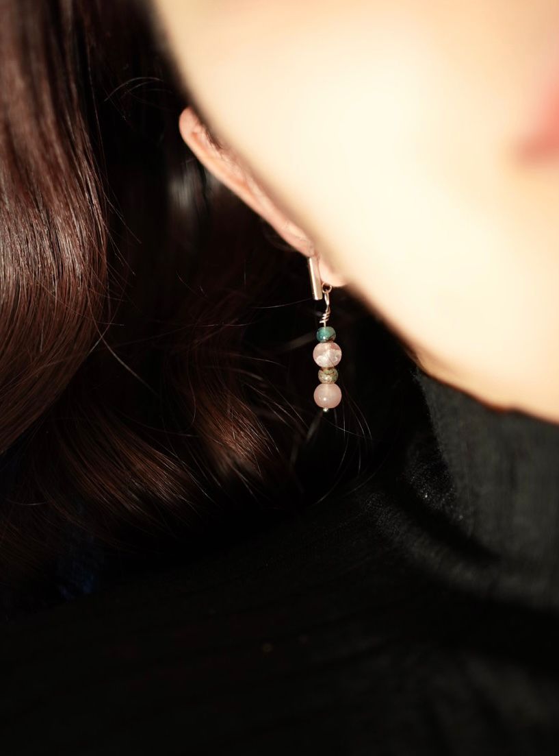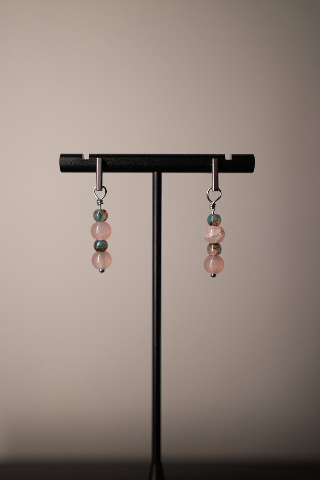 These earrings are handmade using carefully selected beads in soft rose tones, combined with subtle green-blue accents for contrast. The design is simple and balanced, allowing the colours and materials to stand out without feeling heavy.